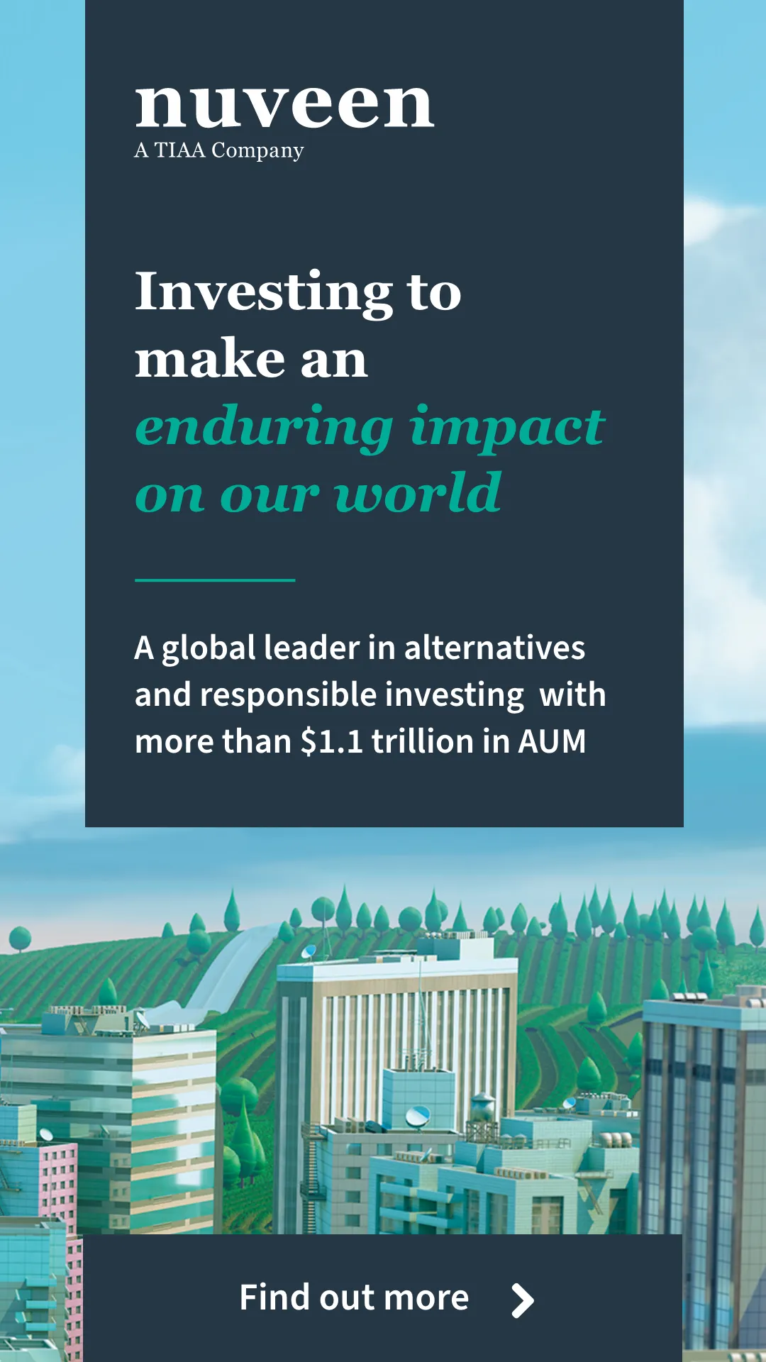 Nuveen, the investment manager of TIAA, offers a comprehensive range of outcome-focused investment solutions designed to secure the long-term financial goals of institutional and individual investors. Nuveen has $1.1 trillion* in assets under management as of 30 September 2022 and operations in 27 countries. Its investment specialists offer deep expertise across a comprehensive range of traditional and alternative investments through a wide array of vehicles and customized strategies. For more information, please visit www.nuveen.com.